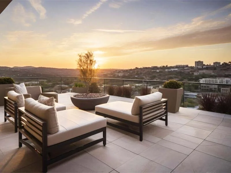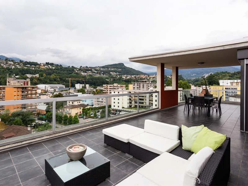 La terrasse est située en hauteur, offrant une vue imprenable sur la ville. Nous allons créer un espace confortable pour profiter de cette vue à couper le souffle. Les propriétaires peuvent désormais se détendre en admirant le paysage urbain environnant.